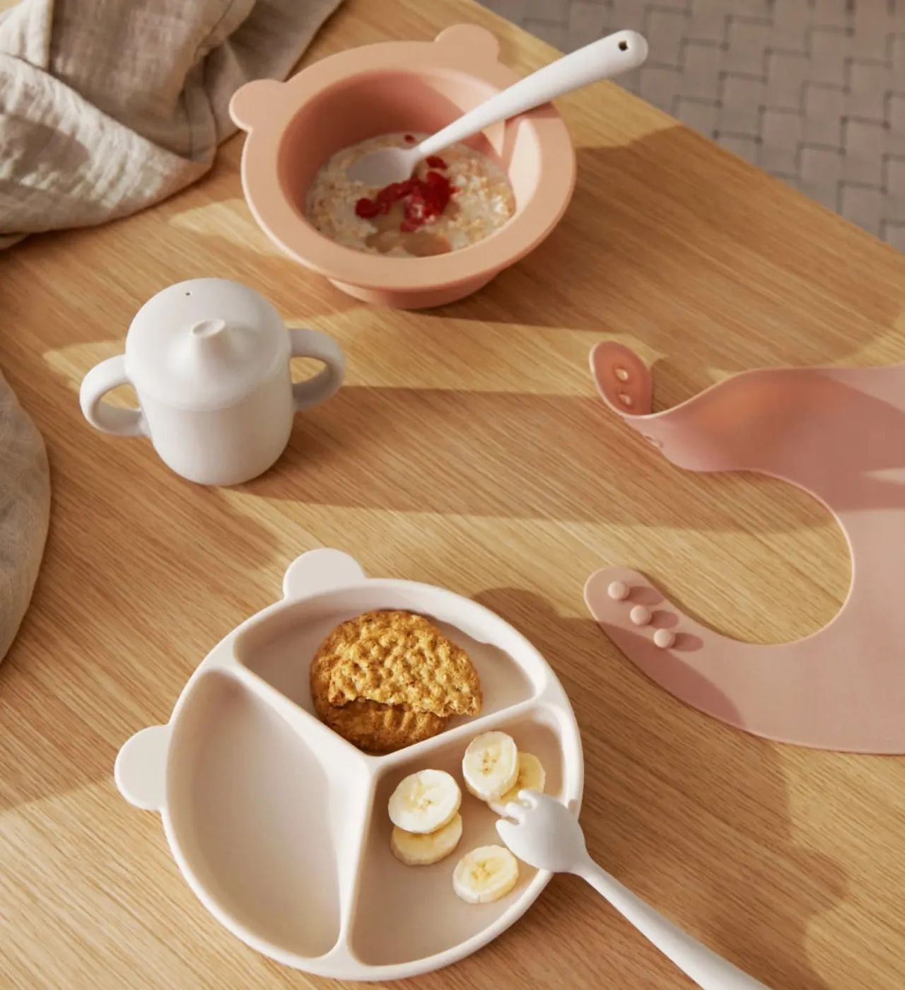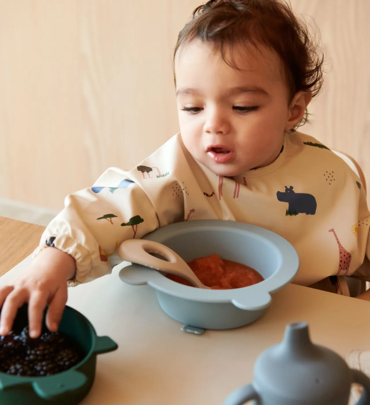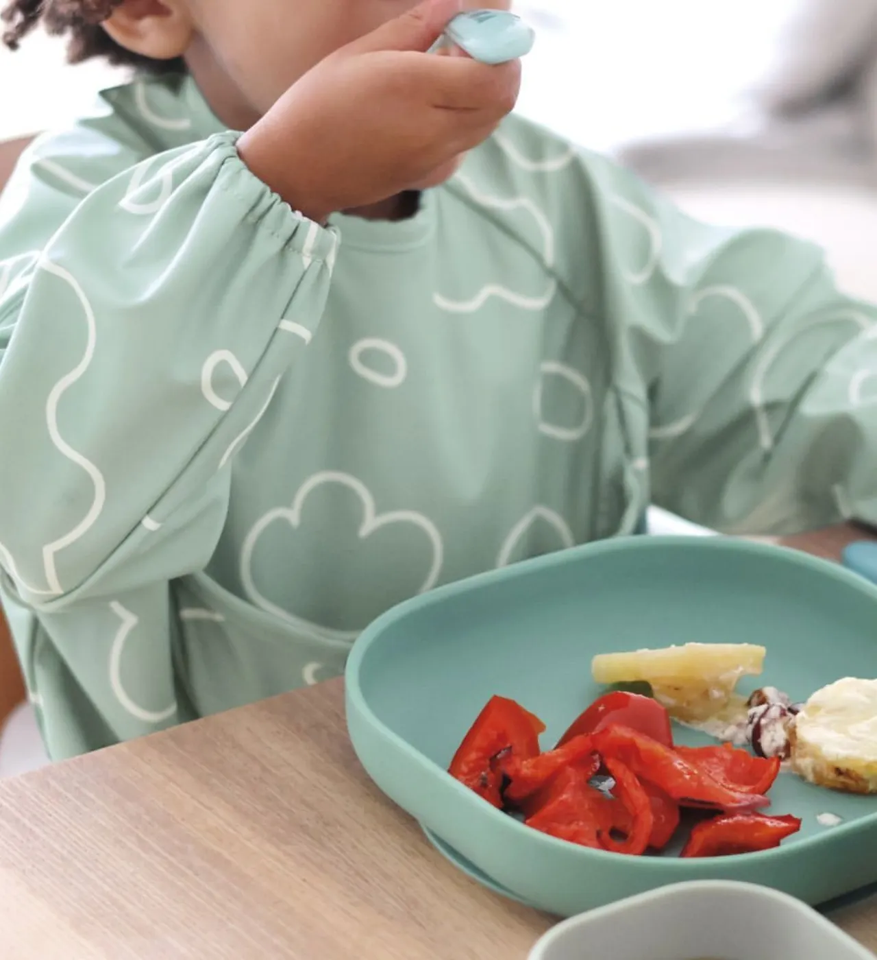 - Warto także zadbać o śliniak, który zbierze jedzenie lub śliniaki z rękawami, które zabezpieczą ubranie dziecka,