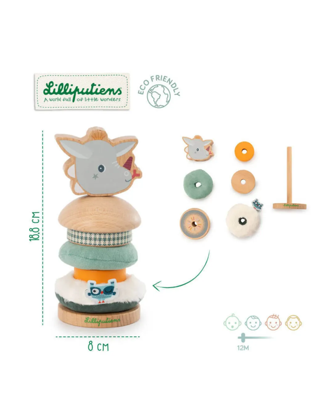 Lilliputiens - drewniana układanka piramida z miękkimi elementami Smok Joe 12 m+