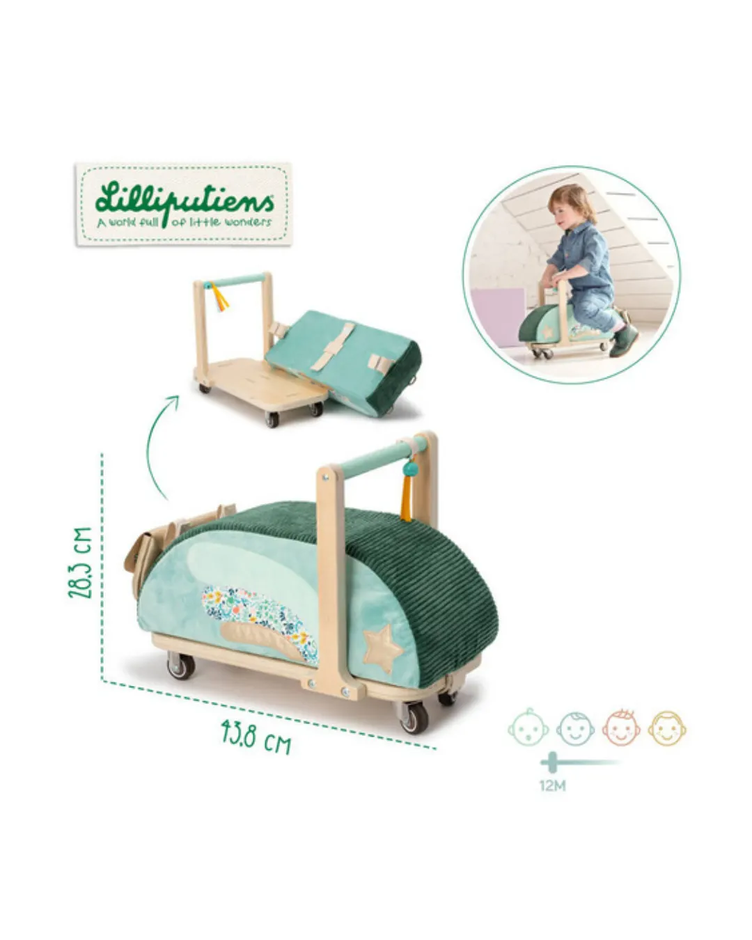 Lilliputiens - drewniany jeździk 2 w 1 z miękkim siedziskiem i torebką Smok Joe 12m+