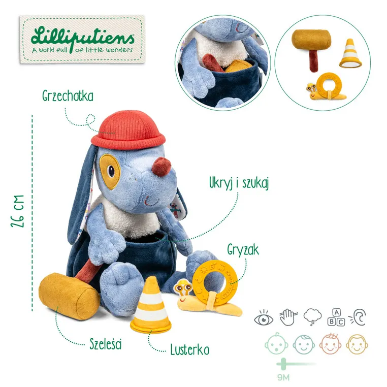Lilliputiens - przytulanka aktywizująca wielofunkcyjna z akcesoriami Piesek Jules 9m+