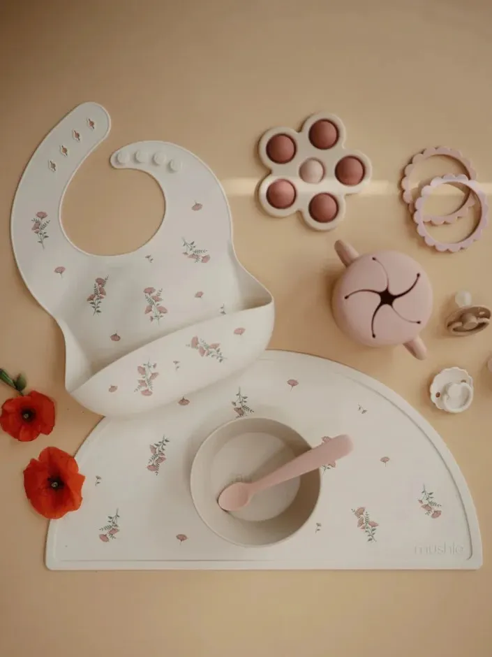 Mushie - śliniak silikonowy z kieszonką Pink Flowers