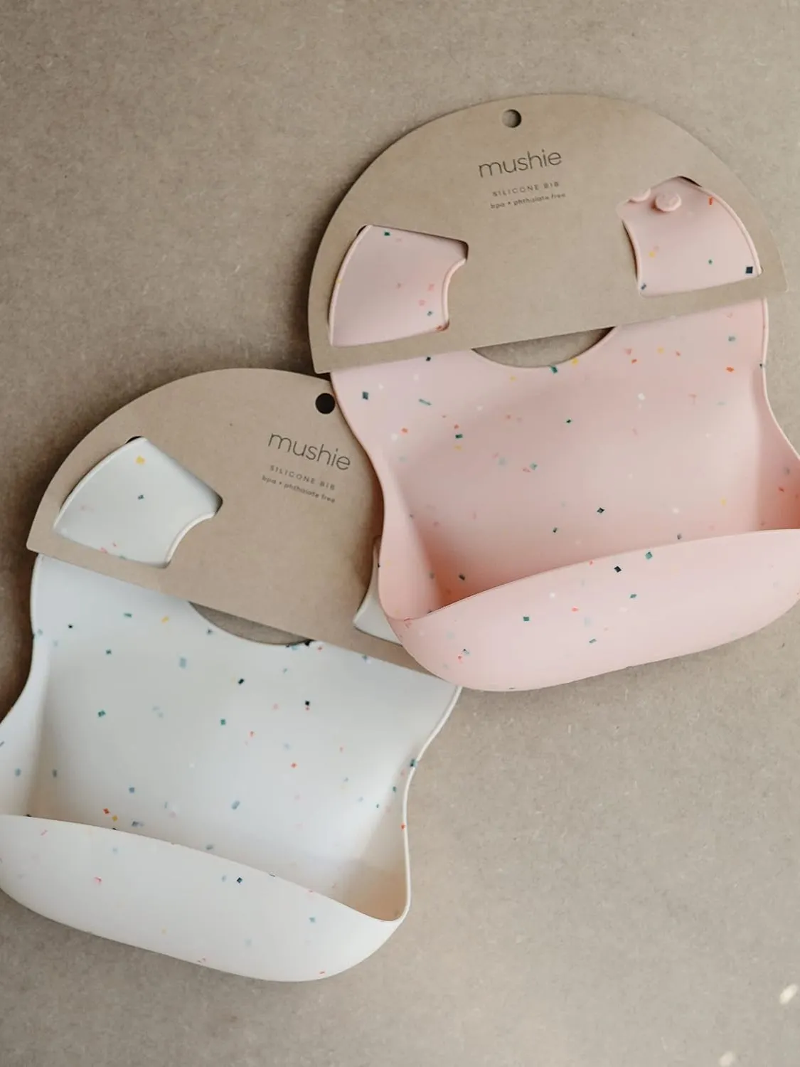 Mushie - śliniak silikonowy z kieszonką Powder Pink Confetti